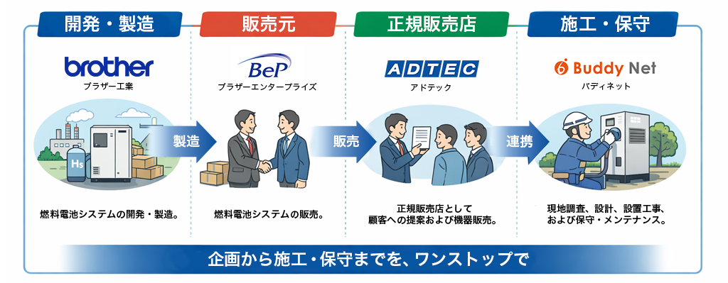 本取り組みでは、メーカー・販売・施工の各社が専門領域を担い、円滑な製品提供を行います。 ● ブラザー工業 : 燃料電池システムの開発・製造。 ● BEP :燃料電池システムの販売。 ● アドテック: 正規販売店として、顧客への提案および機器販売。 ● バディネット: 現地調査、設計、設置工事、および保守・メンテナンス。
